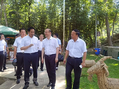 南充市政協(xié)副主席、閬中市委書記張斌(右三),浙江天臺(tái)縣委書記管文新(右二)考察調(diào)研楊家河景區(qū)旅游扶貧工作。